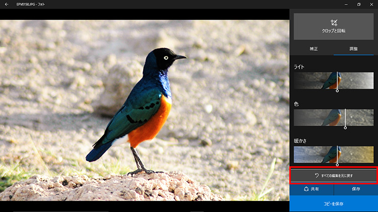 「すべての編集をやり直す」をクリックすると、元の写真に戻ります。