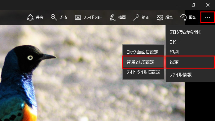 画像を表示した状態で、画面右上の「・・・」をクリックし、[設定]-[背景として設定]を選択します。