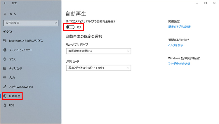 自動再生をオフにしておくと、ウイルスが実行される危険性を抑えることができます。