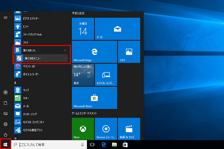 「スタート」ボタンをクリックし、すべてのアプリの一覧から、「筆ぐるめ 25」→「筆ぐるめメニュー」を選択します。