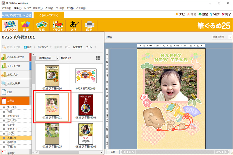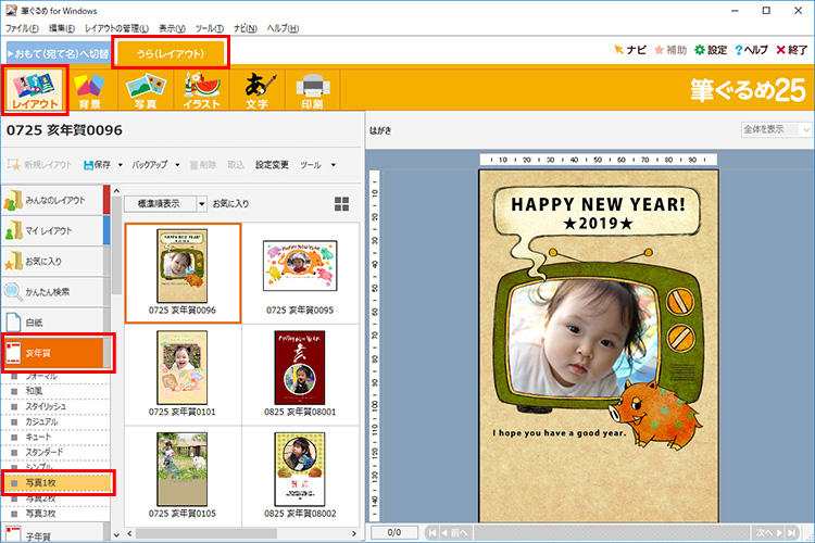 「うら(レイアウト)」タブで「レイアウト」ボタンをクリックし、画面左側の一覧から、使用するレイアウトの種類を選択します。ここでは「亥年賀」の「写真1枚」を選択しました。
