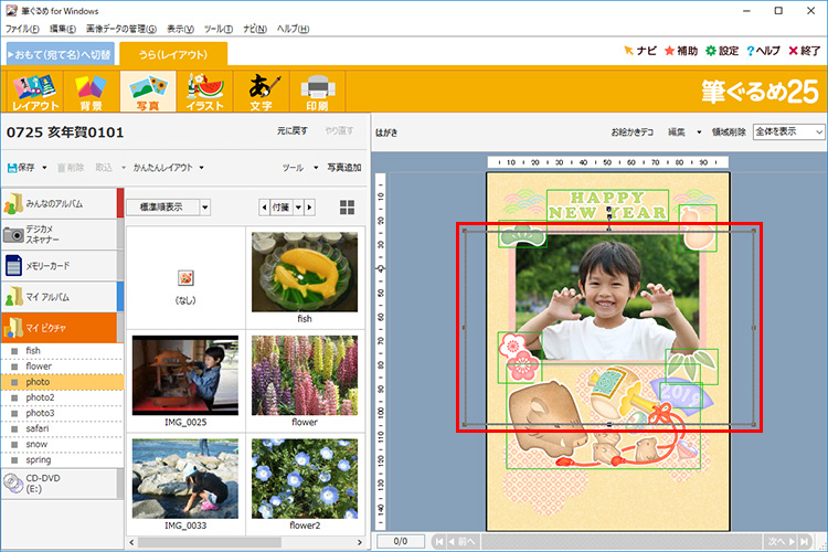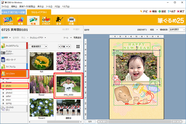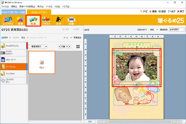- 写真入リの年賀状の場合、[写真]で写真を入れ替える。