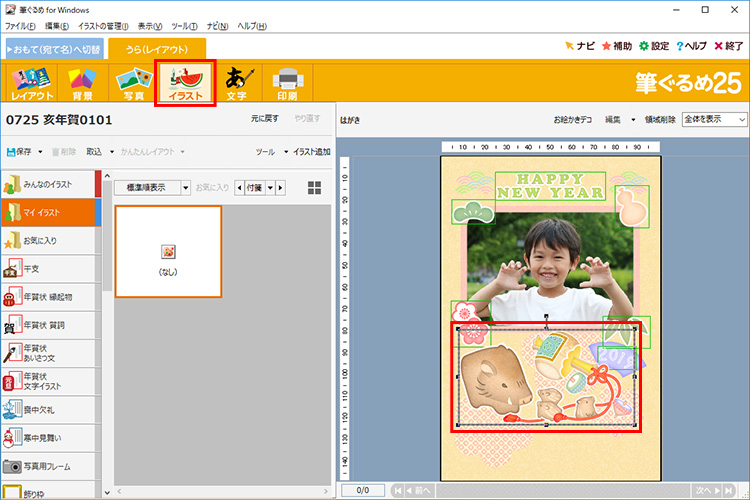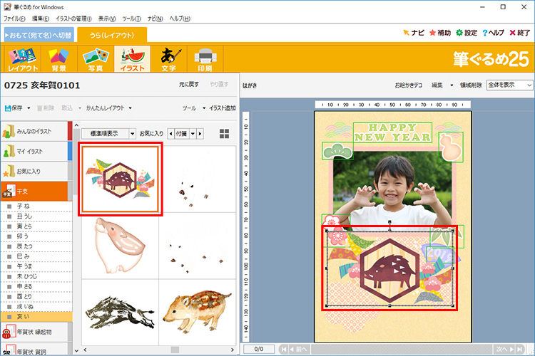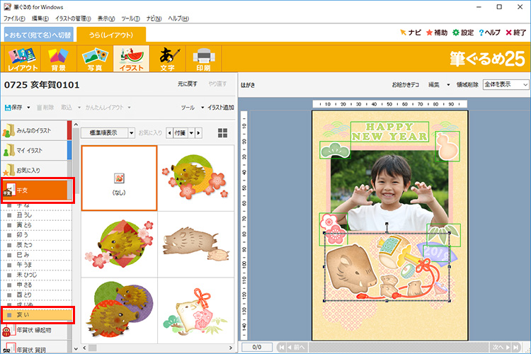 画面左側の一覧で使用するイラストの種類を選択します。ここでは、「干支」の「亥 い」を選択しました。