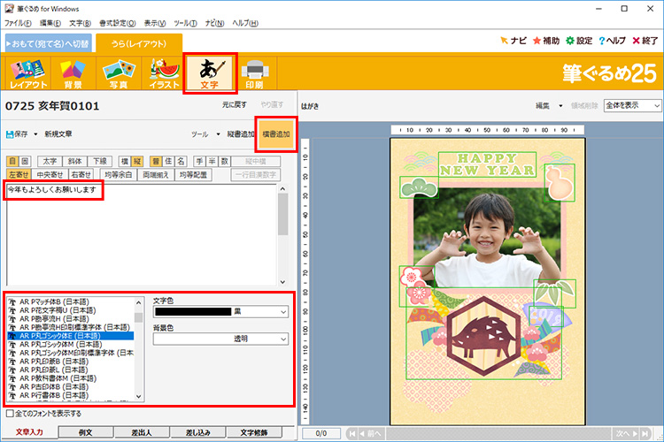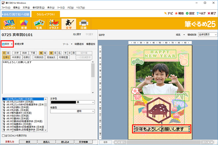 ここでは、筆ぐるめの基本的は操作方法をご紹介しました。筆ぐるめには、たくさんのサンプルや作成するための便利な機能が用意されています。写真やイラスト、文字を変更するだけで、簡単に年賀状を作成できるので、お気に入りの年賀状を作成してください。