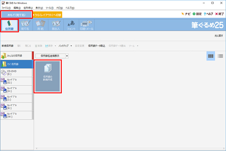 住所録を作ったことがない場合は、「おもて(宛て名)」タブの[住所録]で、[住所録の新規作成]をクリックして住所録を作成します。