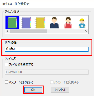 氏名、住所などを記入し、住所録を作成します。住所は、郵便番号を入力して郵便マークのボタンをクリックすると、自動で表示されるので便利です。