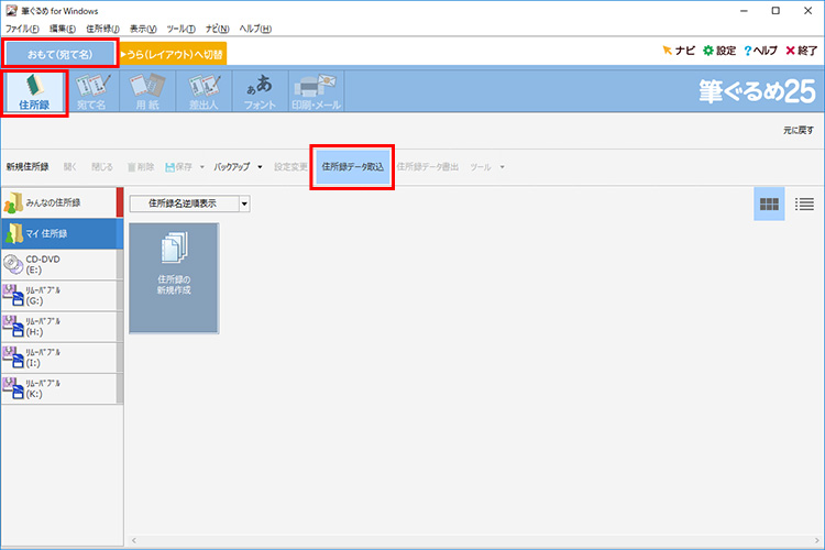 「おもて(宛て名)」タブで、[住所録]の「住所録データ取込」をクリックします。