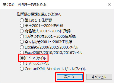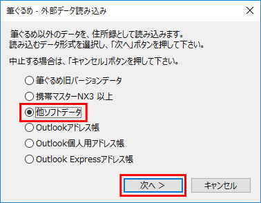読み込む住所録のデータ形式を選択して「次へ」をクリックします。CSV形式の場合は「他ソフトデータ」を選択します。