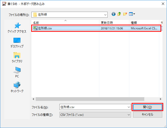 読み込むファイルを選択して「開く」をクリックすると、住所録データを取り込めます。