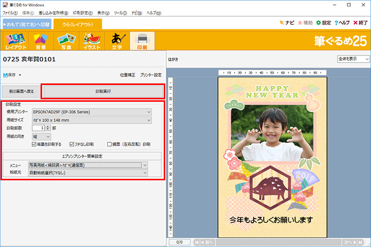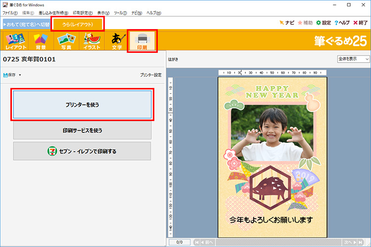 作成した年賀状は、「印刷」の「プリンターを使う」で印刷することができます。