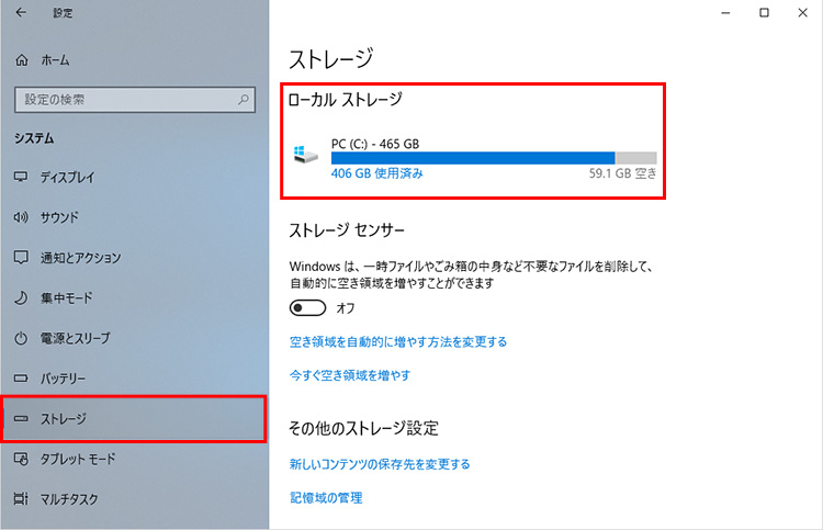 「システム」→「ストレージ」をクリックします。パソコンの容量と、使用済み容量、空き容量が表示されます。