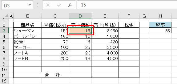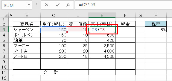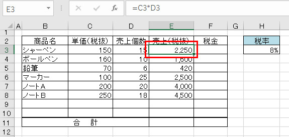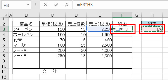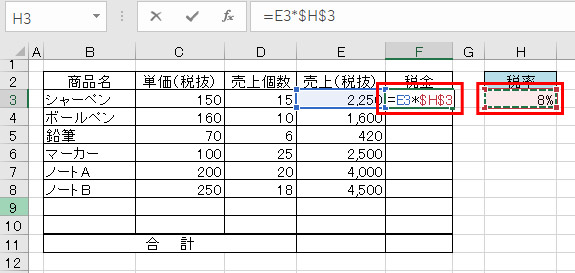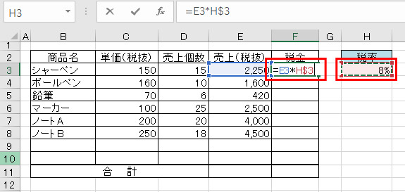 さらにF4キーを押すと、列だけ固定した複合参照で入力されます。