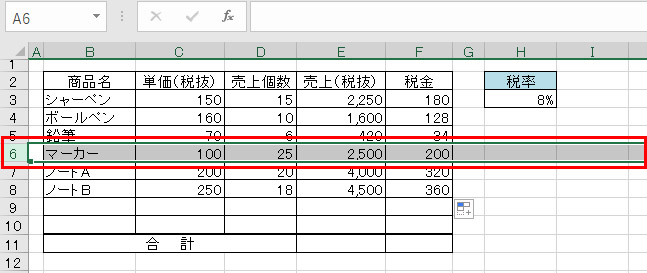 行を選択している場合は行挿入、列を選択している場合は列挿入を行います。