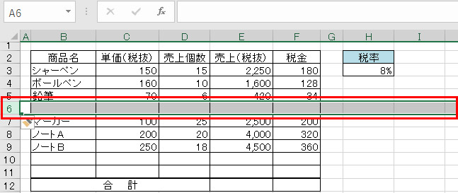 行を選択している状態で、Ctrl+Shift+「+」キーを押します。