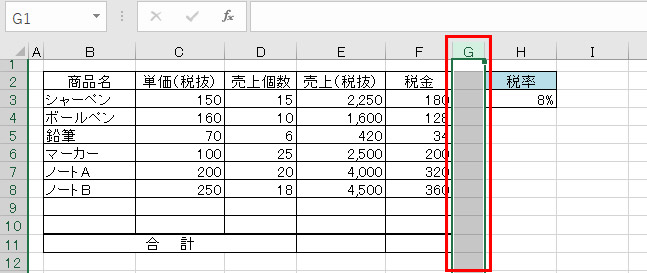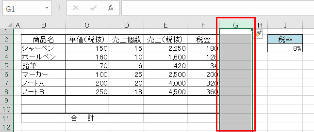 列を選択している状態で、Ctrl+Shift+「+」キーを押します。