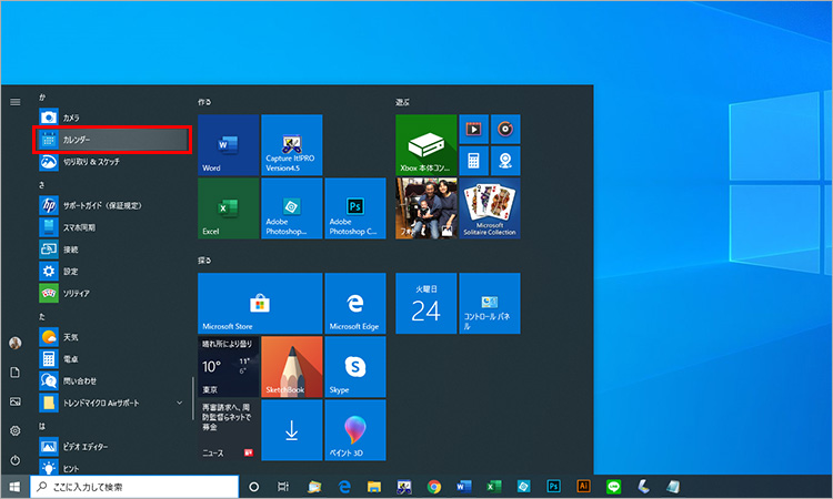スタートメニューから「か行」のグループにある「カレンダー」を選択します。