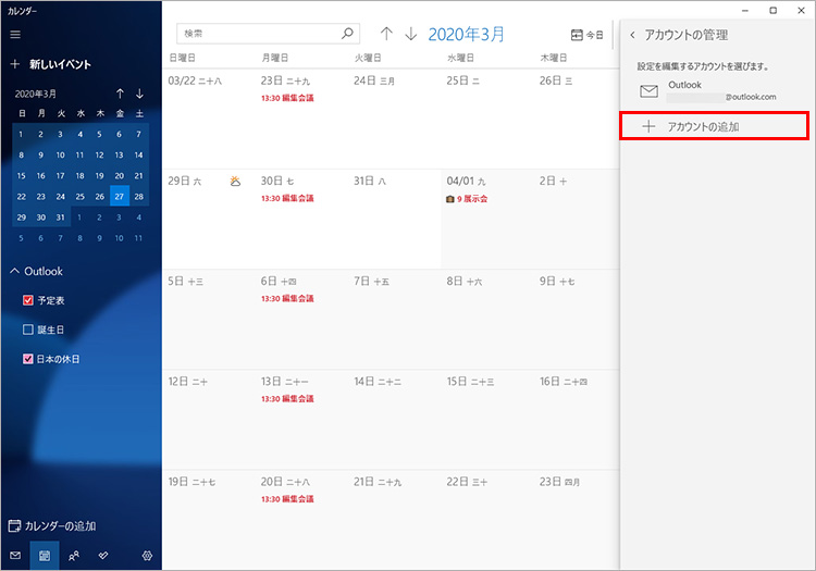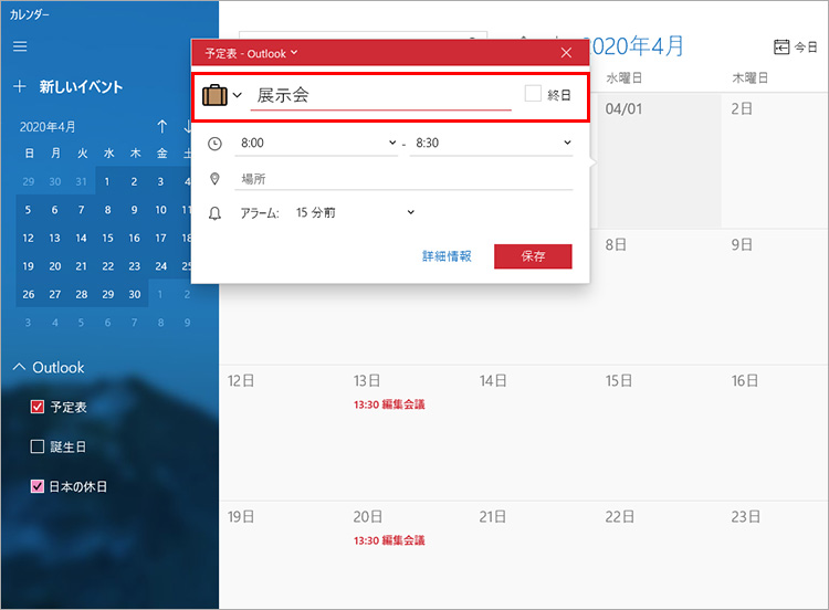 パソコンにMicrosoft Officeがインストールされていて、「カレンダー」アプリと同じマイクロソフトアカウントでログインしている場合は、Outlookのカレンダーと「カレンダー」アプリが自動的に同期され、Outlookのイベントデータが「カレンダー」アプリに表示されます。