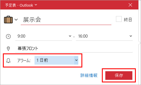 場所を入力し、アラーム実行のタイミングを選択して、「保存」をクリックすると、イベントが作成されます。