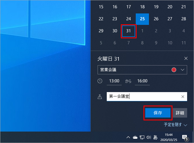 時計をクリックし、目的の日付をクリックして、イベント名と開始時、終了時、場所を入力して「保存」をクリックします。
