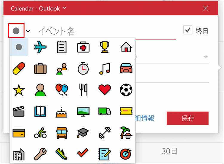 イベントを作成する際、イベントのカテゴリに合わせてアイコンを表示させることができます。アイコンを表示させることで、イベントの種類や重要度を視覚的にアピールさせられます。イベントにアイコンを表示させるには、イベント名の入力欄の左にあるアイコンをクリックすると、アイコンの一覧が表示されるので、目的のアイコンをクリックします。