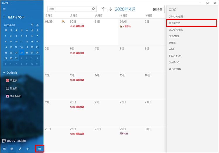 カレンダーを月曜始まりにする、背景を変更するなど、使いやすくカスタマイズするには、画面左下にある「設定」のアイコン(歯車の形のアイコン)をクリックすると表示される「設定」画面を利用します。カレンダーの表示やデザインは「個人用設定」を選択し、カレンダーの設定を変更する場合は「カレンダーの設定」を選択して、表示される画面で設定を変更します。