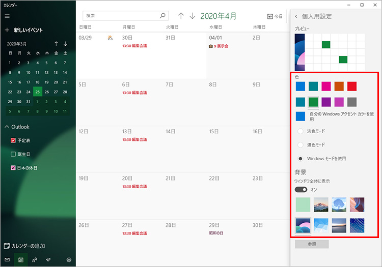 「色」では背景色を選択でき、「淡色モード」「濃色モード」「Windowsモード」では配色のモードを選択できます。「背景」では、背景に表示できる画像を指定できます。