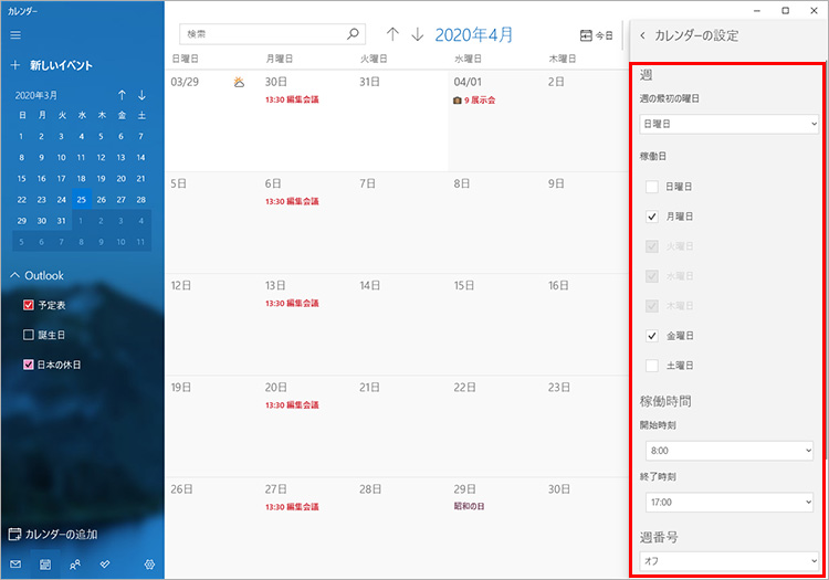 「カレンダーの設定」の「週の最初の曜日」では週の最初の曜日を、「稼働日」と「稼働時間」では、稼働する曜日と始業時間、就業時間を指定できます。また、「週番号」では週番号を、「その他のカレンダー」では六曜など他の暦を表示させることができます。