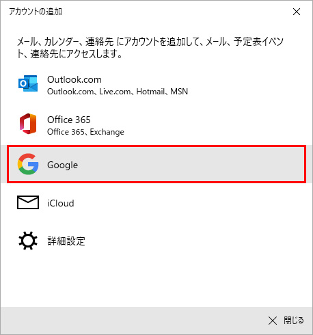 目的のアカウントの種類をクリックします。なお、ここではGoogleアカウントを追加する手順を解説します。