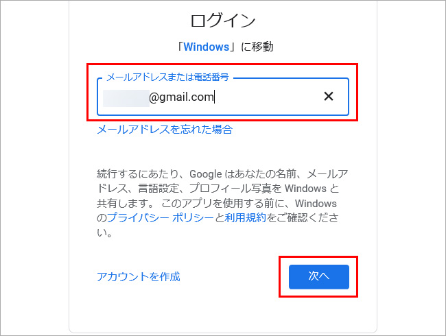 Gmailアドレスを入力し、「次へ」をクリックします。