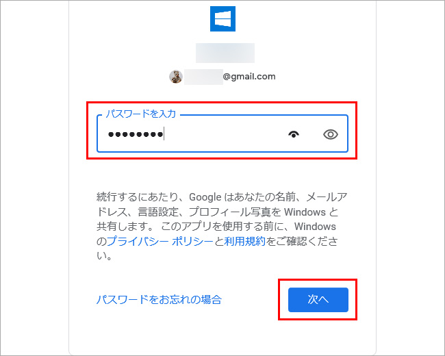 Googleアカウントのパスワードを入力して、「次へ」をクリックします。