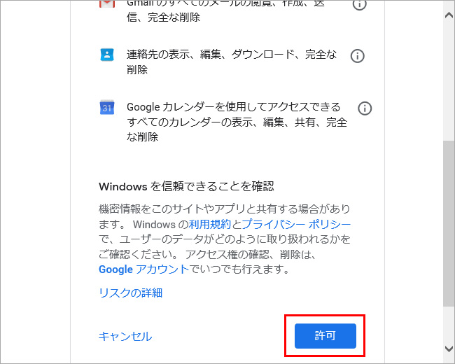 「許可」をクリックして、WindowsによるGoogleアカウントへのアクセスを許諾します。