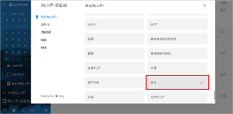 日本の休日を追加したい場合は、「休日カレンダー」→「日本」のように選択します。