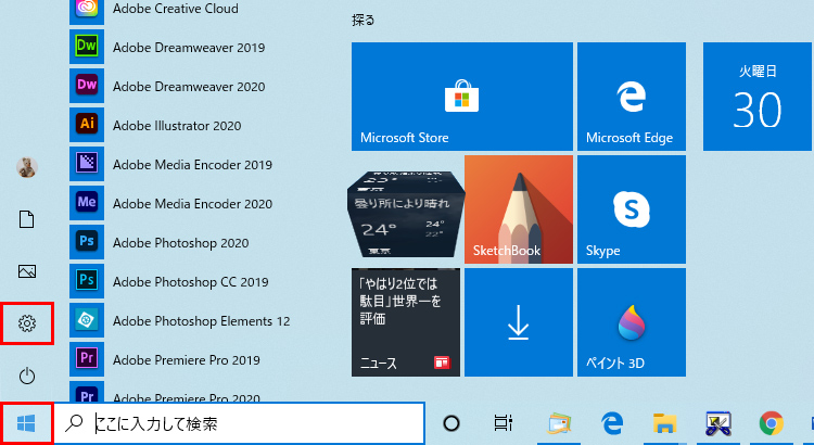 [スタート]ボタンをクリックし、[設定]のアイコンをクリックして、[Windowsの設定]画面を表示します。