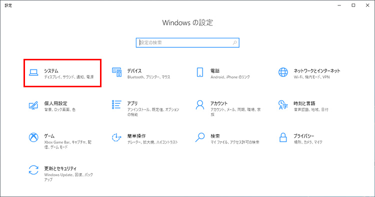 [Windowsの設定]から[システム]をクリックします。