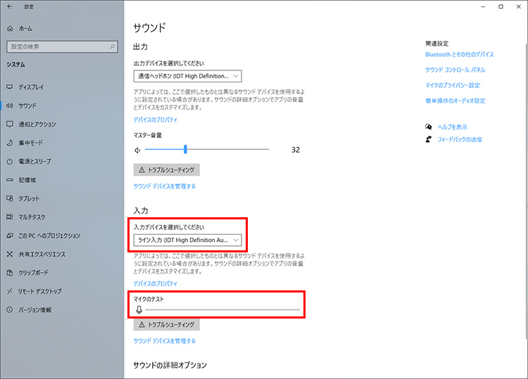 サウンド設定画面が表示されたら、音を立てて[マイクのテスト]のメーターを確認します。メーターに反応がない場合は、[入力デバイスを選択してください]のプルダウンメニューをクリックし、マイクの有無を確認します。マイクが選択できない場合は、パソコンにマイクが搭載されていないか、正しく機能していません。