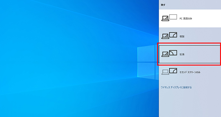 パソコンのキーボードで[Windows]キー+[P]キーを押すと、右にウィンドウが表示されるので、[拡張]をクリックしてデュアルディスプレイを設定します。