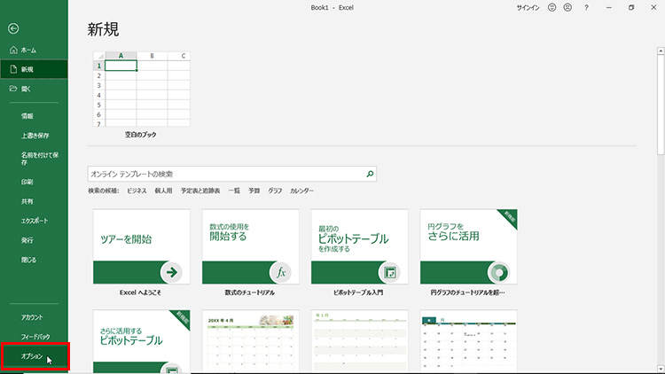「ファイル」タブをクリックして表示された画面から「オプション」を選択します。