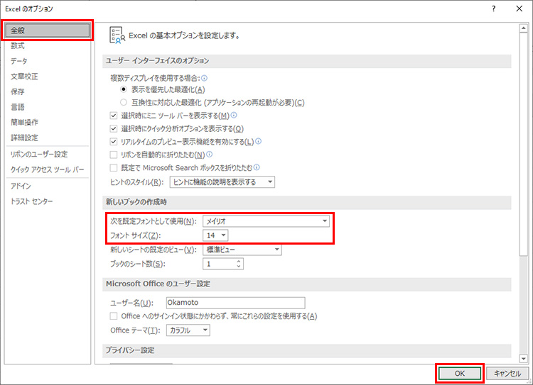 「全般」を選択し、「新しいブックの作成時」の「次を既定フォントとして使用」と「フォントサイズ」を設定し、「OK」をクリックします。