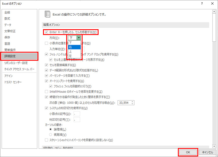 「ファイル」タブから「オプション」で「詳細設定」を選択します。「Enterキーを押したら、セルを移動する」の「方向」で「右」を選択し、「OK」をクリックします。これで「Enter」キーを押すと右方向に移動するようになります。