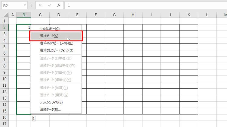 ボタンを離すとメニューが表示されるので、「連続データ」を選択します。
