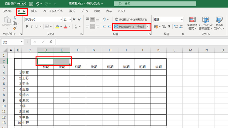 1つにまとめたいセルを選択し、「ホーム」タブの「セルを結合して中央揃え」をクリックします。