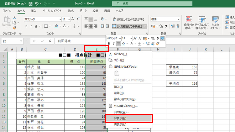 非表示にしたい行、または列を選択して右クリックし、「非表示」を選択します。