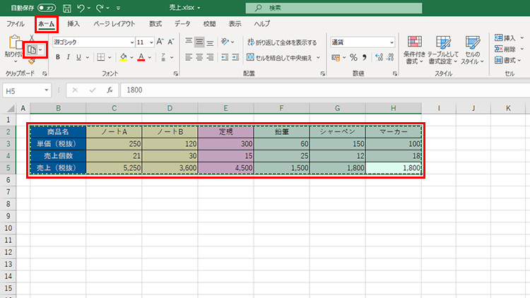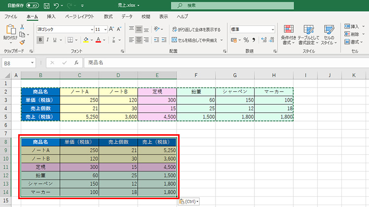表を選択し、「ホーム」タブの「コピー」をクリックするなどしてコピーします。