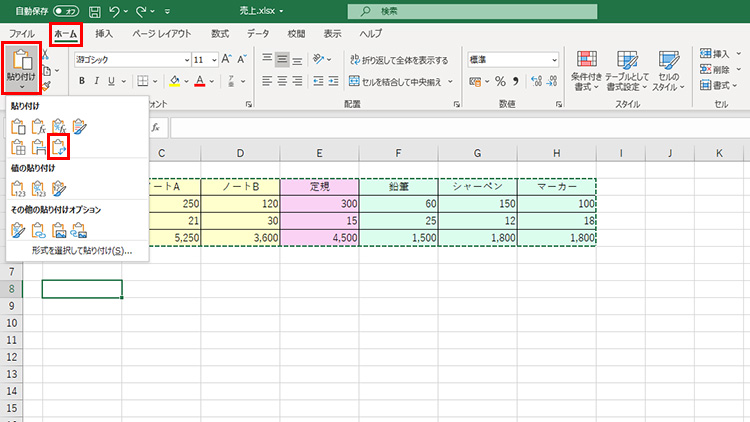 新しい表を作成する位置のセルを選択し、「ホーム」タブの「貼り付け」-「行/列の入れ替え」を選択します。