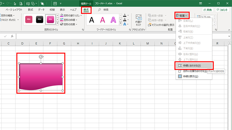 挿入した図形や画像を選択した状態で、「書式」タブの「配置」で、「枠線に合わせる」を選択します。
