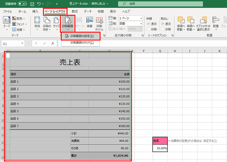 印刷する範囲を選択し、「ページレイアウト」タブの「印刷範囲」-「印刷範囲の設定」を選択します。