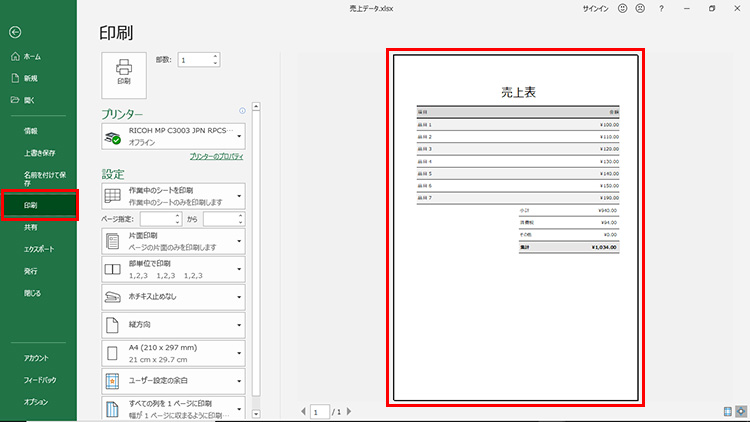 「ファイル」タブの「印刷」を選択すると、プレビューで印刷範囲を確認することができます。