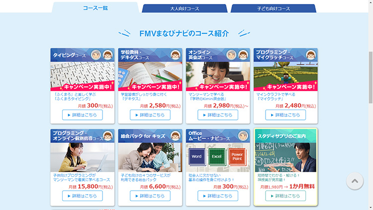 「FMVまなびナビ」は学校教科・英会話・プログラミング・タイピング・Office操作などを学ぶことができる、オンライン学習サービスです。小学生向けの学校教科学習やプログラミング、大人向けのOffice活用と幅広いコースで、パソコンを活用しながら学習をサポートします。
