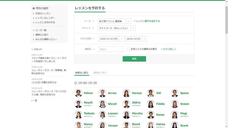 好きな日時と講師を選んでレッスンを予約。自分で予定を立てられるのがオンラインならではです。「みんなの講師レビュー」では、実際に受講した人たちから寄せられた講師のレビューも確認することができるので安心です。
