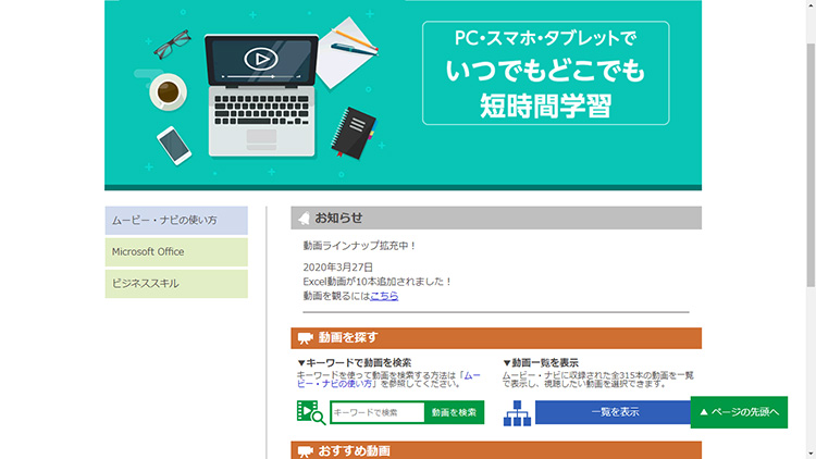 Microsoft OfficeのWord, Excel, PowerPointを動画を見ながら学べます。実際の操作方法を動画で見ながら自分でも行えるので、しっかり身につきます。基本から応用まで約300本もの動画を用意しています。